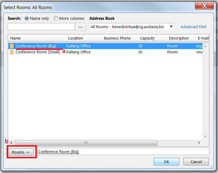 4. Add the meeting room to the Rooms Field by doing either of the following: