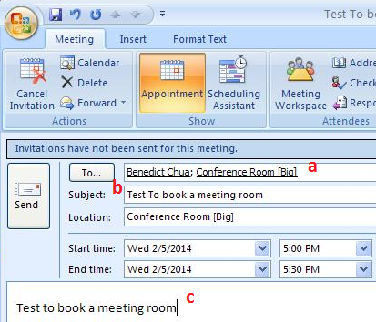 5. The meeting room which been select will be listed under To filed as recipient and the Location field