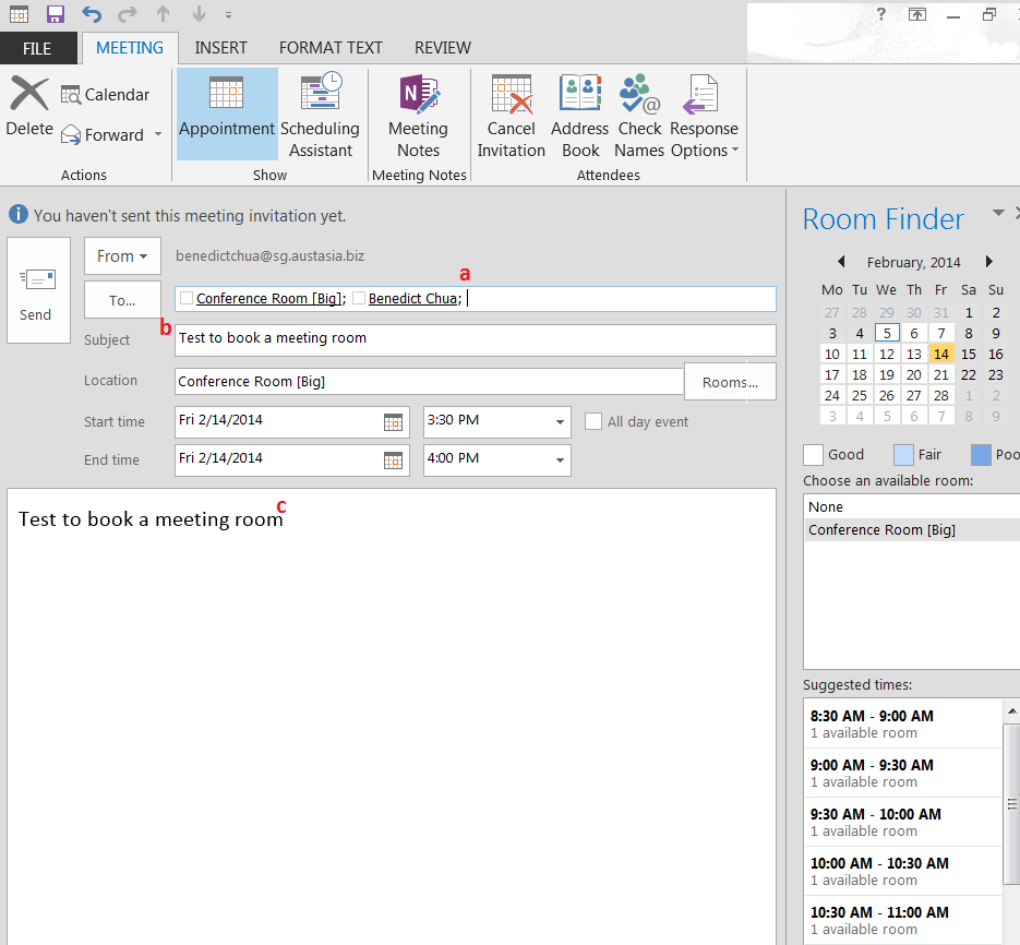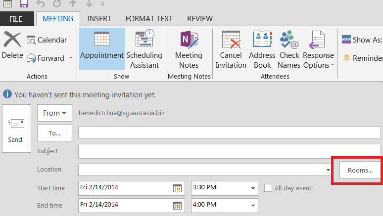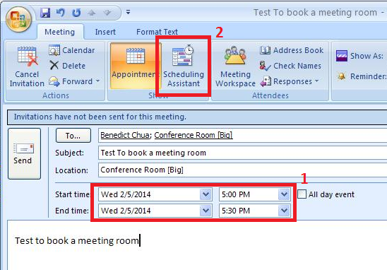 Note: You can activate Scheduling Assistant, to know the availability of the room and participant time slot